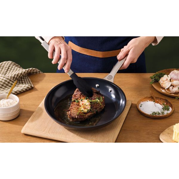 A trusted cooking companion for everything from searing to browning and more. With a heavy-gauge aluminum core and advanced ceramic coating made without PFAS, it distributes and retains heat efficiently, releases food with little to no added oil or fat, and wipes clean with ease.