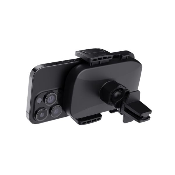 Drive with confidence using this secure-fit phone holder designed for air vent mounting. It grips firmly with rubberised side clamps and back clamp, allows one-handed insertion and removal via a quick-release cradle button, and offers adjustable viewing angles thanks to the rotatable, tiltable ball-joint hinge.